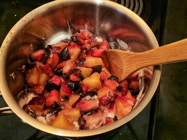 - 2.25 lbs. red, black, or purple plus, pits removed and roughly chopped (I used a combination because I got 1 lb. from our CSA farmbox and then when I went to the grocery store to get more, I forgot what type we got. But as you’ll see, everything turned out just fine)