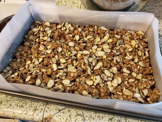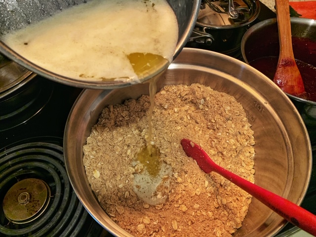 - Preheat oven to 350 degrees and line a 9×13 inch pan with parchment paper with overhang on all sides. In a large bowl, combine oats, almond flour, brown sugar, baking powder, salt, and cinnamon. Add melted butter and stir until the mixture forms streusel-like crumbs.