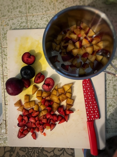 - 2.25 lbs. red, black, or purple plus, pits removed and roughly chopped (I used a combination because I got 1 lb. from our CSA farmbox and then when I went to the grocery store to get more, I forgot what type we got. But as you’ll see, everything turned out just fine)