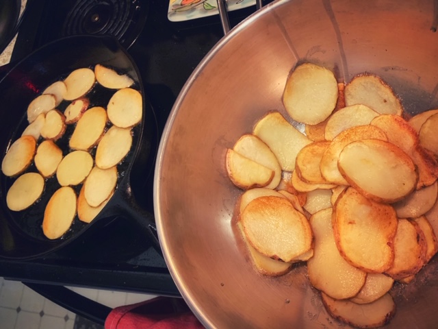 - Heat up a cast iron skillet with a couple tablespoons of oil and fry the potatoes in batches. Don’t overcrowd your skillet as that will cook the potatoes unevenly. Add a little more oil into the pan for each batch if you need it. Fry the potato slices for about a minute or two on each side. You do not need to cook them thoroughly, just about halfway. After you take them out, generously salt them when they are still hot. You can drain them carefully on a rack but I just used a big mixing bowl here. There’s no wrong way, really.
