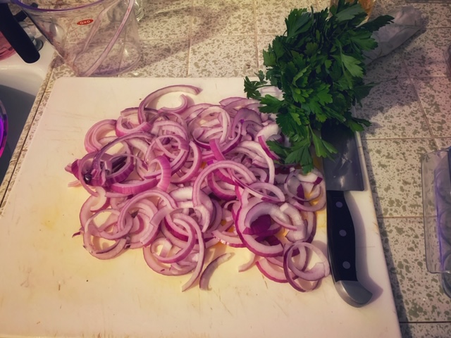 - While the potatoes are frying, use some of the waiting time between each batch to slice up the onion. I was going for rings too but the onion I had was pretty big so I ended up cutting each ring in half. If you have smaller onion, I think it’ll look pretty as rings. Also, chop the parsley. It doesn’t need to be finely chopped but don’t make them too coarse either.