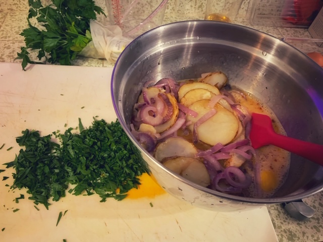 (Sorry about the yellow cutting board – I used it to chop up some kimchi and I can’t seem to get rid of the yellow…) - Get another large mixing bowl (here we go again with the excessive bowl usage) and crack all the eggs into the bowl. Salt and pepper generously and mix in the fried potatoes, sliced onions, and parsley. Make sure you mix them well so you don’t end up with random pockets of tons of parsley in your tortilla.