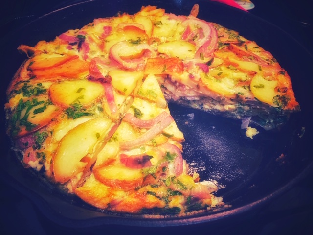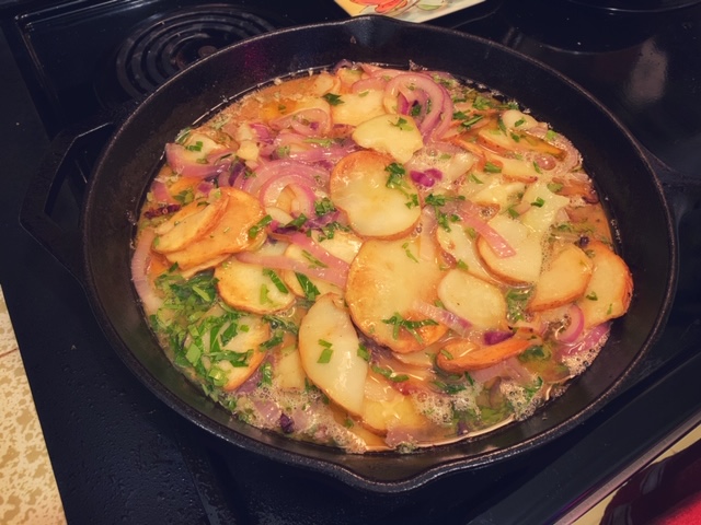 - If your cast iron skillet has cooled down, heat it back up with a few more tablespoons of oil. Pour in your egg mixture and let the tortilla cook uncovered. After about 8-10 minutes, you should see the eggs starting to cook. In my picture below, you can see that I have quite a bit of oil pooling here. I made the mistake of pouring in too much oil at the beginning but it really didn’t hurt anyone. When you see the eggs starting to solidify, put a lid on your skillet and lower the heat to medium-low. You can also pop it in a 400°F oven if you happen to remember to pre-heat your oven ahead of time (which I didn’t…). Continue cooking for another 8-10 minutes or until the eggs are cooked through and the potatoes are soft.