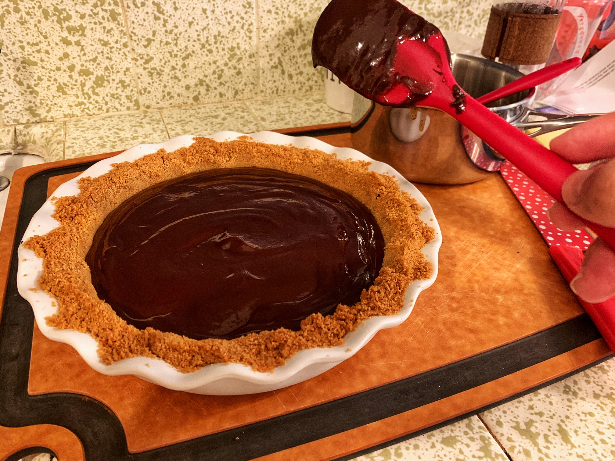 3. Place chocolate and butter in a large bowl. Combine cream, coffee, and 2 tablespoons of water in a small saucepan and bring them to a boil. Remove from heat, cover and let steep for about 5 minutes. After steeping, strain the cream into the bowl with chocolate and butter. Stir until melted and ganache is smooth. Pour this mixture into the crust and smooth the top. Chill in the fridge until set. This should take an hour or so.