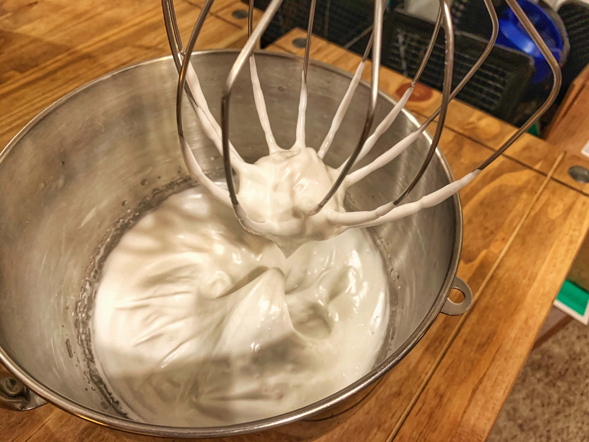 4. Make the meringue: using an electric mixer, whip the egg whites with a pinch of salt until light and frothy. Add sugar one tablespoon at a time, making sure it’s incorporated before adding more. This will ensure that the sugar gets fully combined and your meringue will not be gritty or grainy. After all the sugar has been incorporated, continue whipping until you reach stiff peaks. This means that when you lift up the whisk, you will see peaks that will not fall on its own. When you tilt the mixing bowl, you should not be able to “pour” it out. If you can, then it is not stiff enough (that’s what she said!).