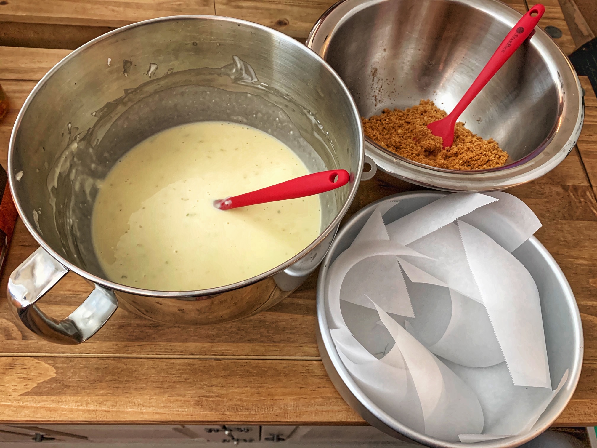 - While the crust cools, make your filling: beat softened cream cheese with an electric mixer until fluffy. Then, add in the sugar and beat until well combined and the sugar is dissolved. Add key lime juice, zest from one of the limes, sour cream, and vanilla. Beat until smooth. Mix in flour and salt at low speed, scraping down the sides of your mixing bowl as needed. Lastly, add in the 3 eggs all at once and mix until everything is incorporated.
