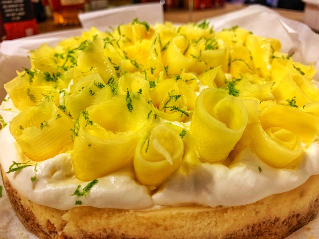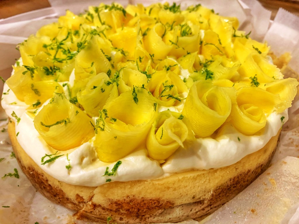 - Peel mango and slice very thinly lengthwise. Tip: use a vegetable peeler to get thin slices. Be careful when slicing because peeled mangoes are very slippery. Beat heavy cream with sugar until stiff peaks, then spread over the top of the cooled cheesecake. Take each mango slice and roll them up into a tight curl. Stick them on the whipped cream in a circular pattern to decorate. If your mango slices aren’t thin enough to create this, then feel free to just lay them decoratively however you see fit. Final step: sprinkle zest from the other lime as a final garnish.
