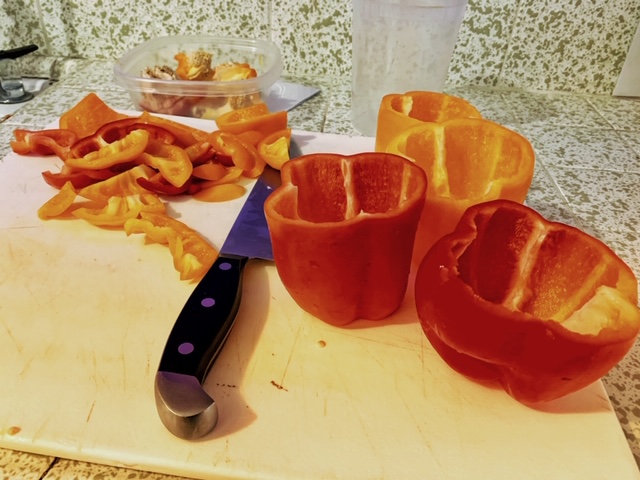 - Pre-heat oven to 400°F and prep your bell peppers. I cut about 0.5-0.75 inch off the top and take out the ribs and seeds. Don’t throw away the tops, cut around the stem and then chop them to about 0.5-inch dice. If your peppers are lop-sided, slice some off the bottom so that they can sit upright in your baking dish.