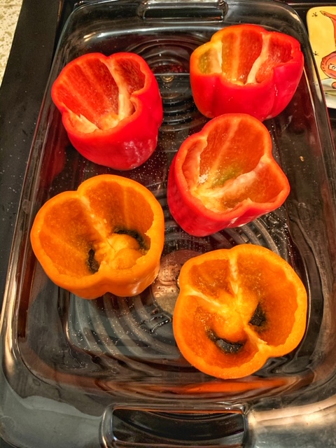 - Put the peppers in an oven-safe dish, drizzle some oil, salt, and pepper on the inside of the peppers. Bake for about 10-12 minutes until they soften a bit. The first time I made this dish, I didn’t pre-bake them so the end result was still pretty raw peppers. If that’s your thing, then go for it but we prefer them softer/more cooked.