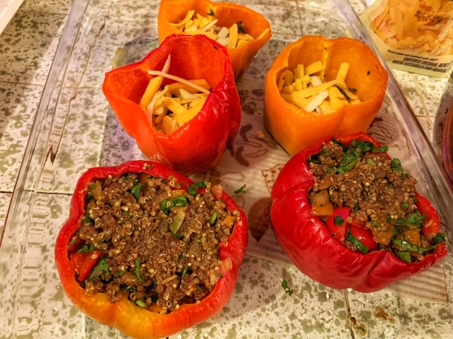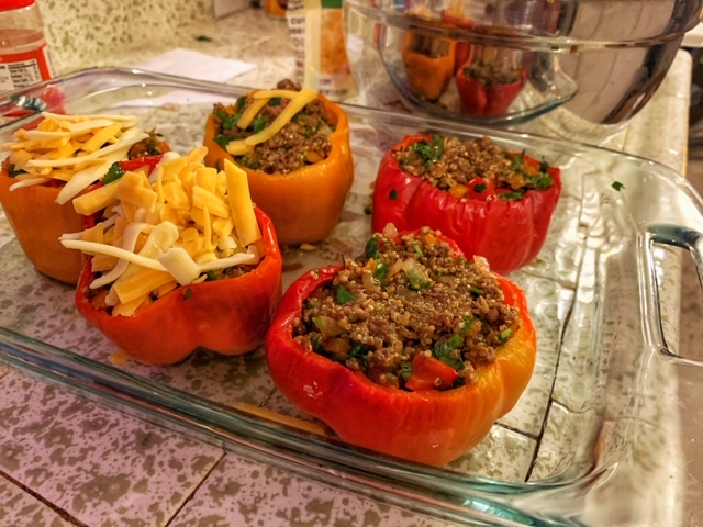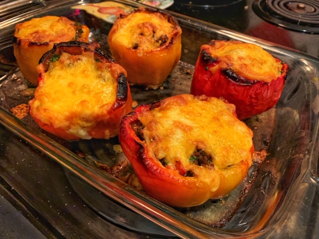 - I like making some layered stuffing here, so I put in the beef mixture about one-third of the way in the peppers, then add some shredded cheese. Add more beef mixture and fill up to the top of the peppers. Then top with more cheese. After all the peppers are stuffed, return them to the 400°F oven and bake for 18-20 minutes. Everything is cooked so this part of cooking is making sure everything is re-heated properly and the cheese is melting. At the end of cooking time, I like to sprinkle a little more cheese on top and then broil them to get some crisp cheese crust. Enjoy!