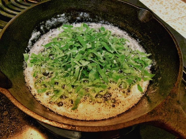 - Heat up 1 tablespoon of butter on a medium-size skillet over medium-high heat. When the butter starts foaming, put in the sage leaves and let it cook for 3-4 minutes. Take out the sage, leaving the butter in the skillet, and drain on a plate lined with paper towel.