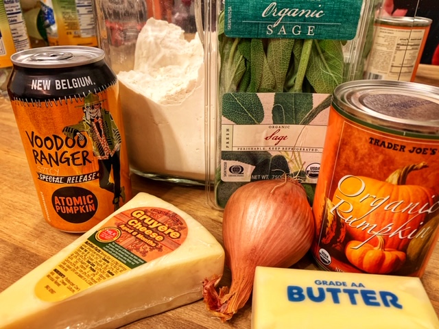 - Combine the flour, sugar, salt, baking powder, and shredded Gruyere cheese in a large mixing bowl. Add in the pumpkin puree, sage leaves, and the Voodoo Ranger Atomic Pumpkin, and stir to to combine all ingredients together. Make sure there are no lumps of flour but do not over mix.