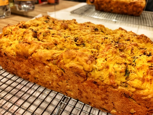 - Bake for 45-50 minutes or until a toothpick comes out clean-ish. You may not get a completely clean toothpick because of the cheese in the batter but don’t bake the bread longer than 50 minutes to avoid drying out.
