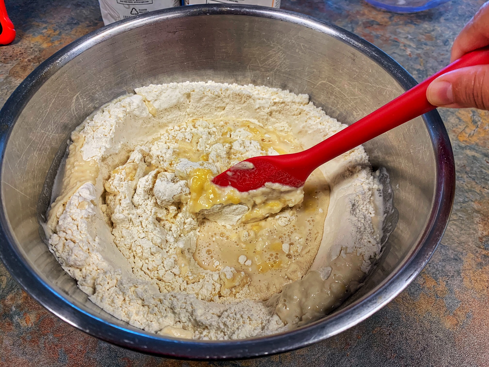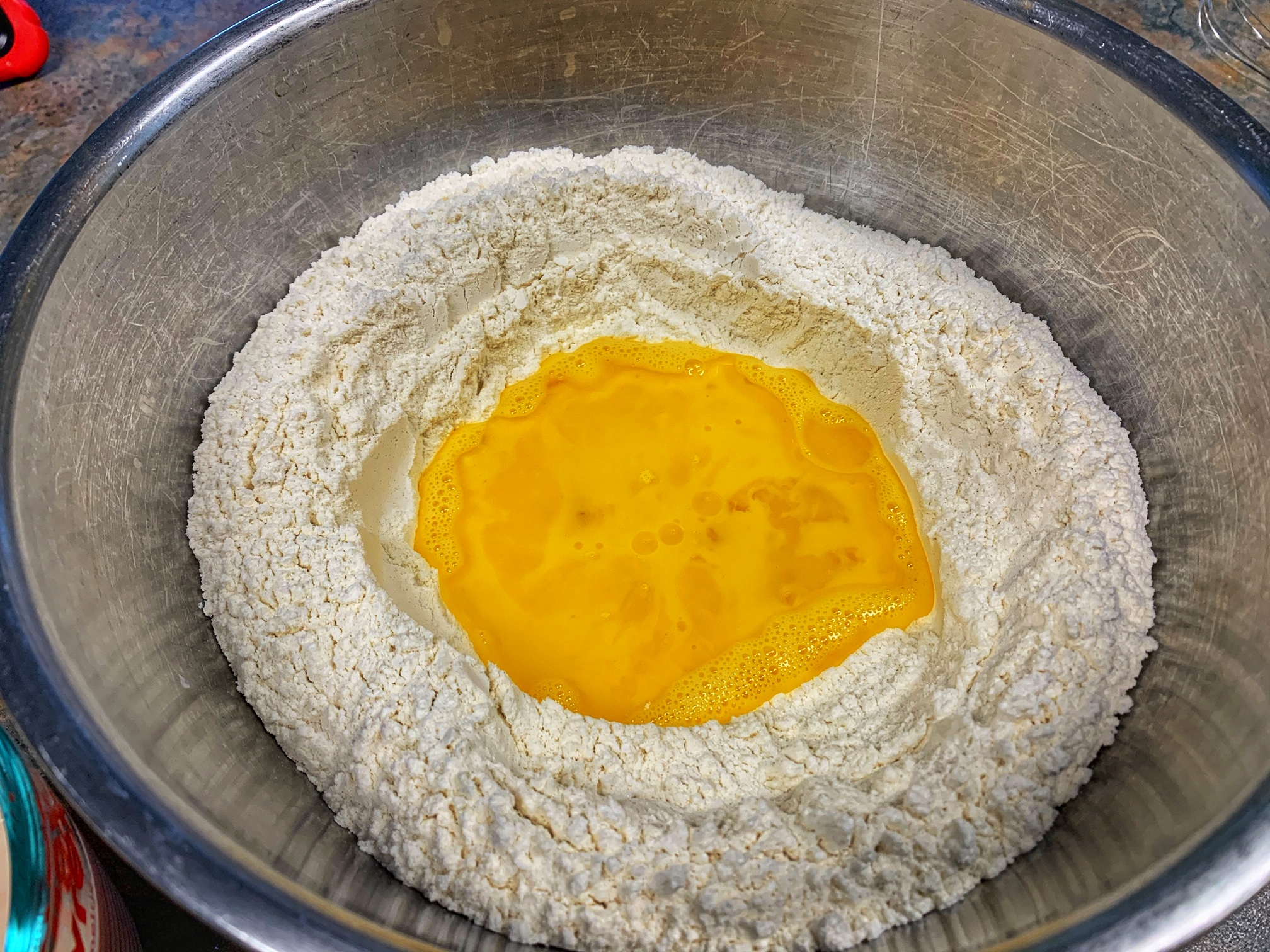 - Make a well in the center of your flour and pour in the mixture of eggs, oil, honey (if using), and yeast. Using a fork or a spatula, mix them into the flour from the outside in. Do this slowly until you get everything sort of combined into a shaggy dough. Shaggy like the hairdo, not the singer of Mr. Boombastic. You’ve never heard of him? I guess I’m dating myself…