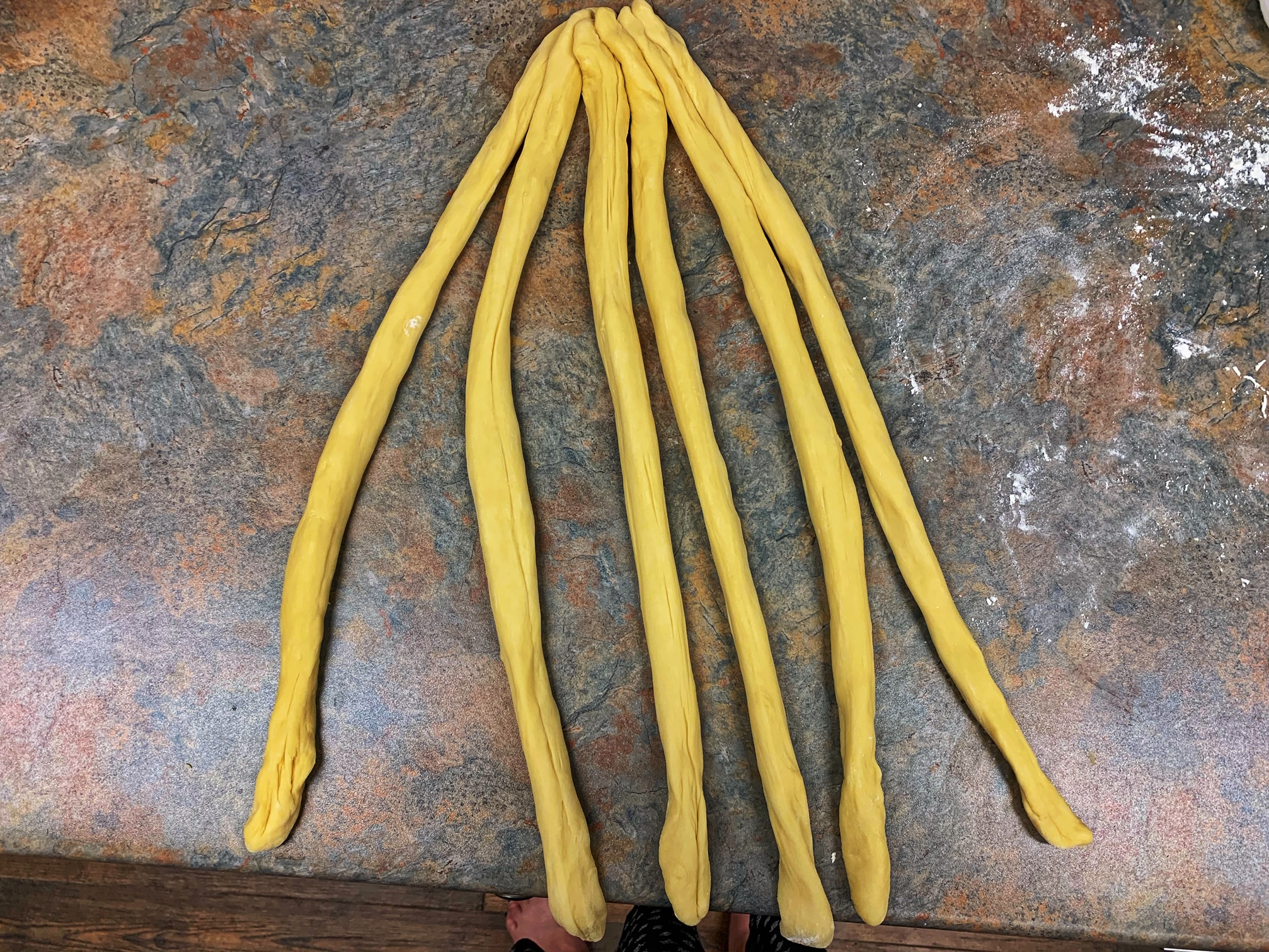 - After the dough has risen, divide them into three or six equal pieces (this depends on the type of braid you want to do, 6 or 3-strand). Roll each piece out into a long rope, kind of like how a certain pretzel place rolls them out (admit it, you’ve spent at least 3 minutes of your life watching them). Braid the strands together. If you’re making 3-strand braid, then braid it like hair. I’m talking regular ol’ braid, not fishtail, not french braid, just regular. If you’re making 6-strand braid, I found this tutorial to be very helpful. Honestly, whatever braid you decide to do, this bread is going to be delicious so go crazy!