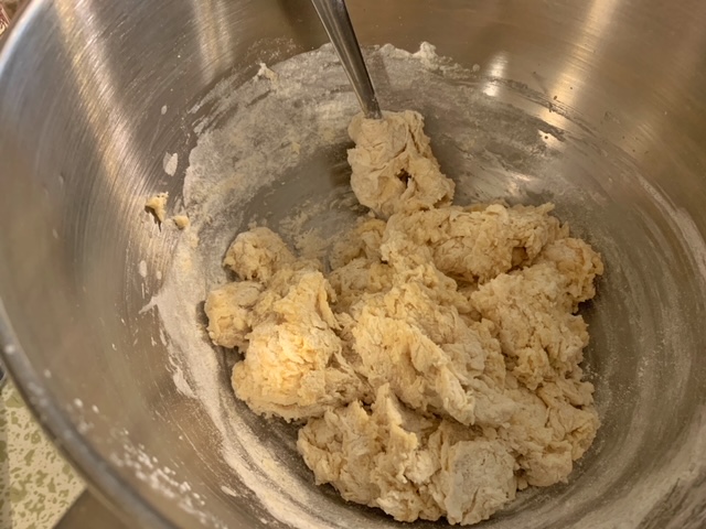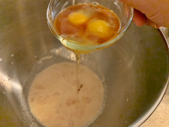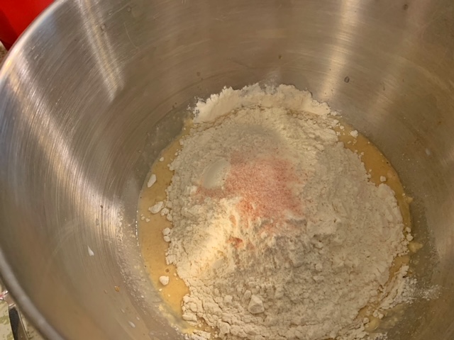 - Whisk in the eggs and vanilla and then stir in about 2.5 cups of flour, reserving the remaining flour for later in the process. Add salt and then mix to combine. You can use a spoon or fork to do this as you are only trying to achieve shaggy dough.