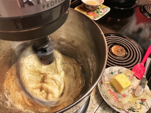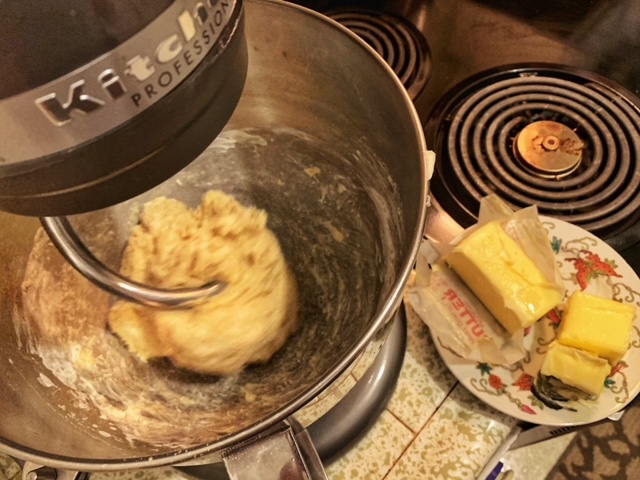 - Put the dough hook on the mixer and then start adding the softened butter 1-2 tablespoons at a time. You want to make sure all the butter gets incorporated before adding the next 1-2 tablespoons. This does take a little bit of time but great things come to those who wait. At least that’s what I read on a fortune cookie sometime ago.