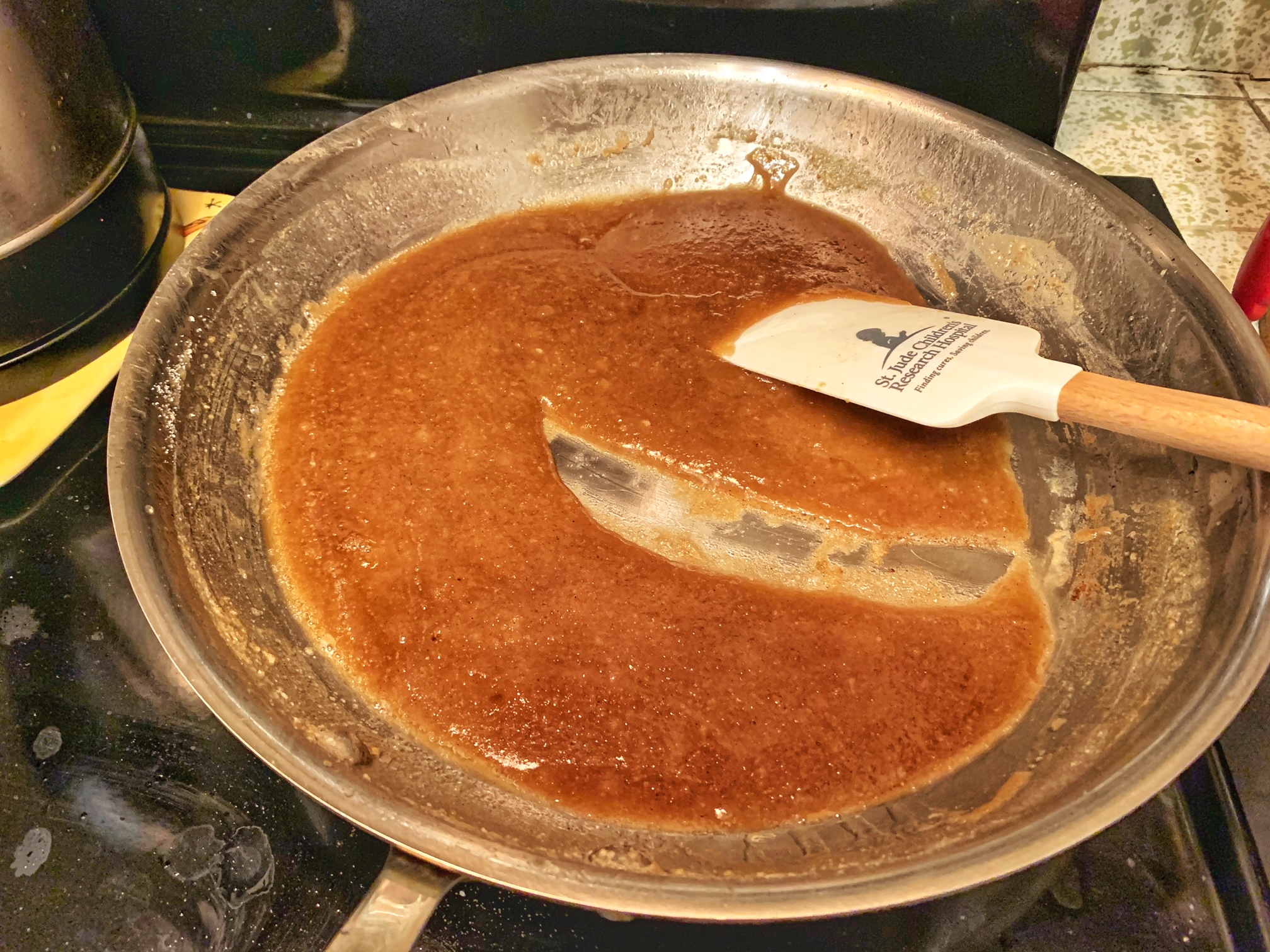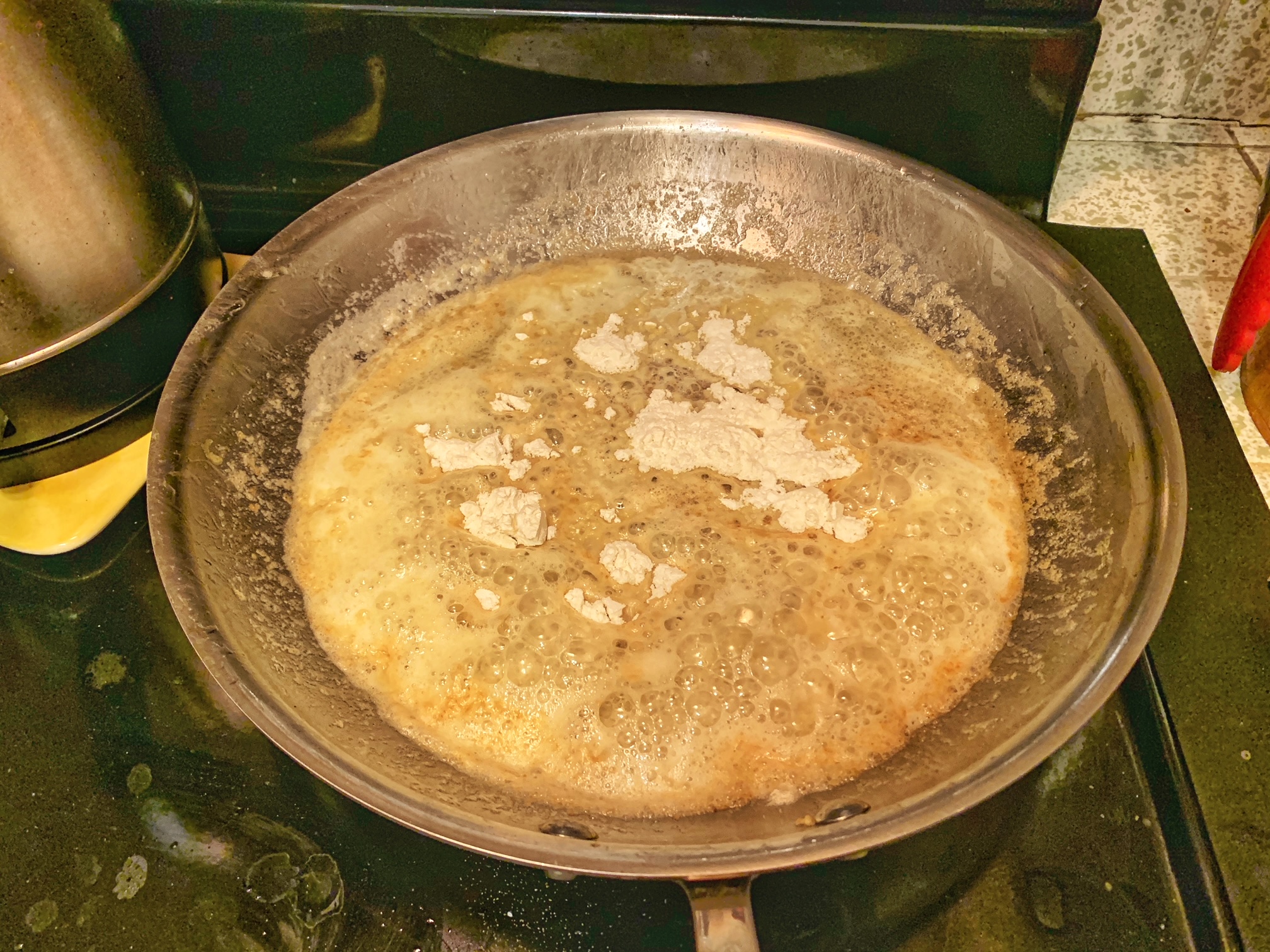 - Return the saute pan to medium-low heat and put in the remaining 6 tablespoons of butter to melt. Once the butter is completely melted, put in the all-purpose flour and stir until they are mixed well. Continue to cook for 30 seconds while stirring constantly. Pour in the water and stir until you get a mixture that looks kind of like elmer’s glue, consistency-wise. Color-wise, it should be blonde like Chris Hemsworth’s hair.