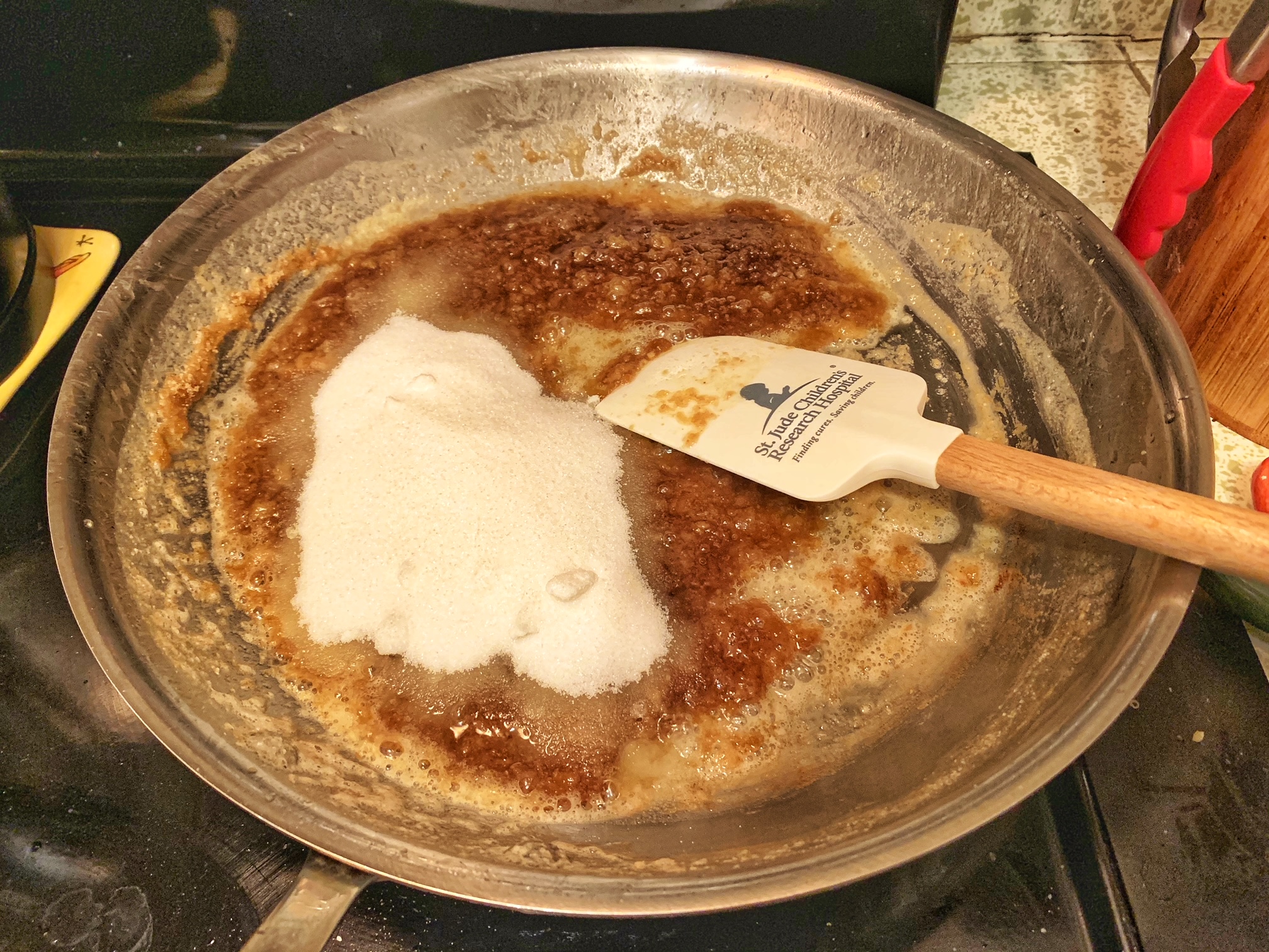 - Put in brown sugar, white sugar, salt, and cinnamon. Stir to combine. Lower the heat to low and cook for another minute or two just until everything comes together into a cohesive mixture. Turn off the heat and let the mixture cool down.