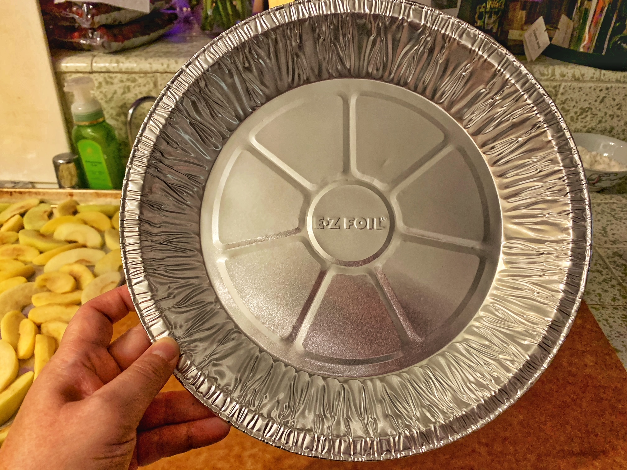 - Roll out the bottom pie crust and lay over the pie plate. I’m using disposable foil pie pan this time because I’ve seen two different websites saying that glass pie plate is best and ceramic pie plate is the worst. I only have ceramic pie plate so I figured I’d try the disposable foil pie pan as those two websites also said foil is still better than ceramic. And we all know that the interwebs are always correct, right?