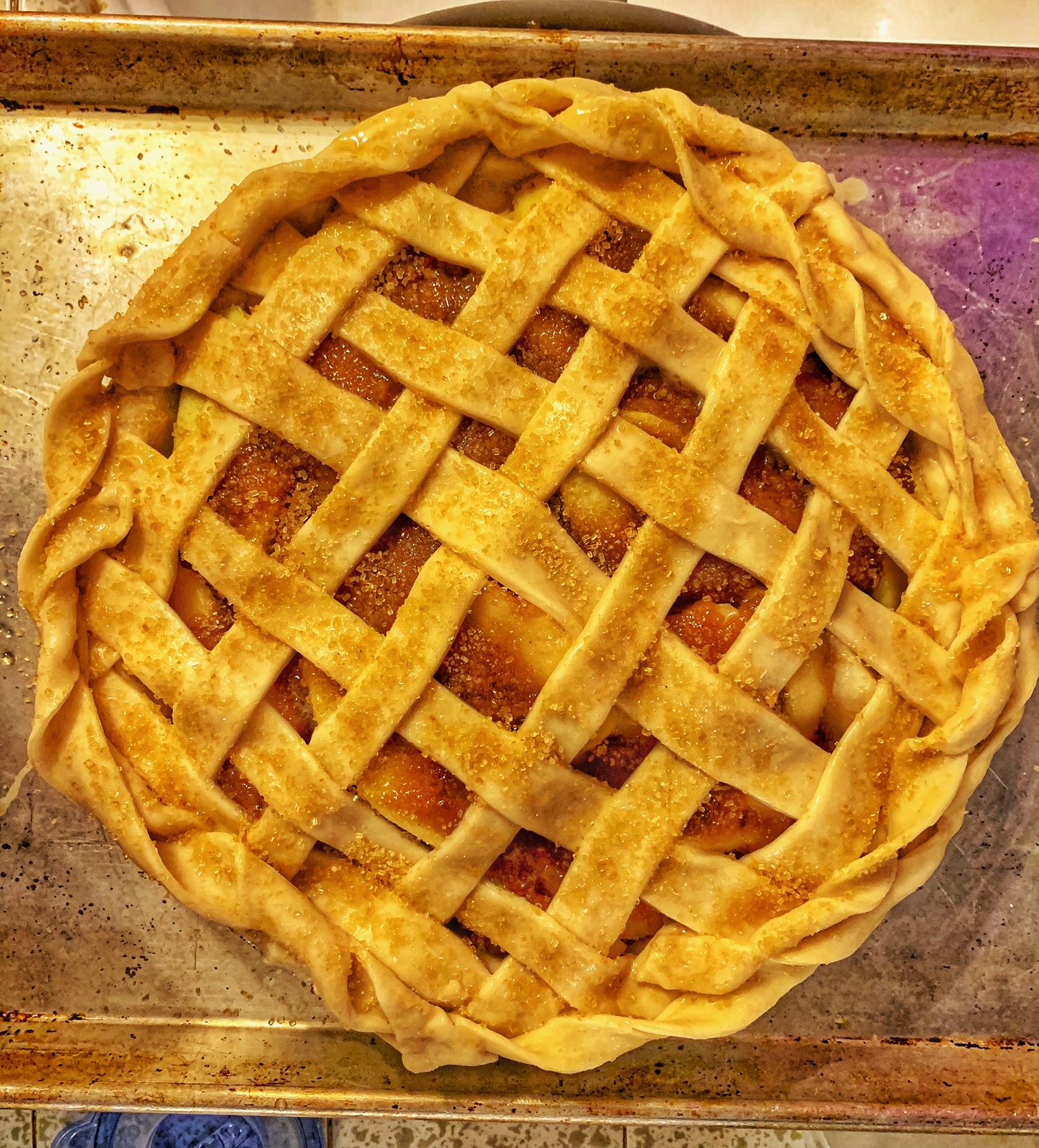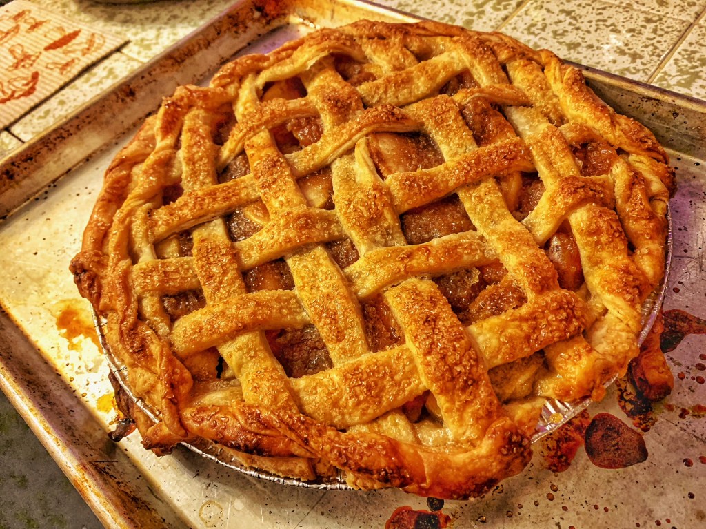- Lay the cooled apple slices into the pie and then pour the cooled sugar mixture on top. The sugar mixture is going to be pretty thicc so instead of pouring, you might find yourself spooning. That’s fine just as long as you make sure they’re pretty evenly distributed throughout the apple slices. Roll out the top crust and lay it on top of the apples in a lattice pattern. You don’t have to do a lattice pattern if you prefer not to, but this pie needs to have holes on top to let out steam. I think we all agree here that even with other people, sometimes we need to let out steam through a few holes.