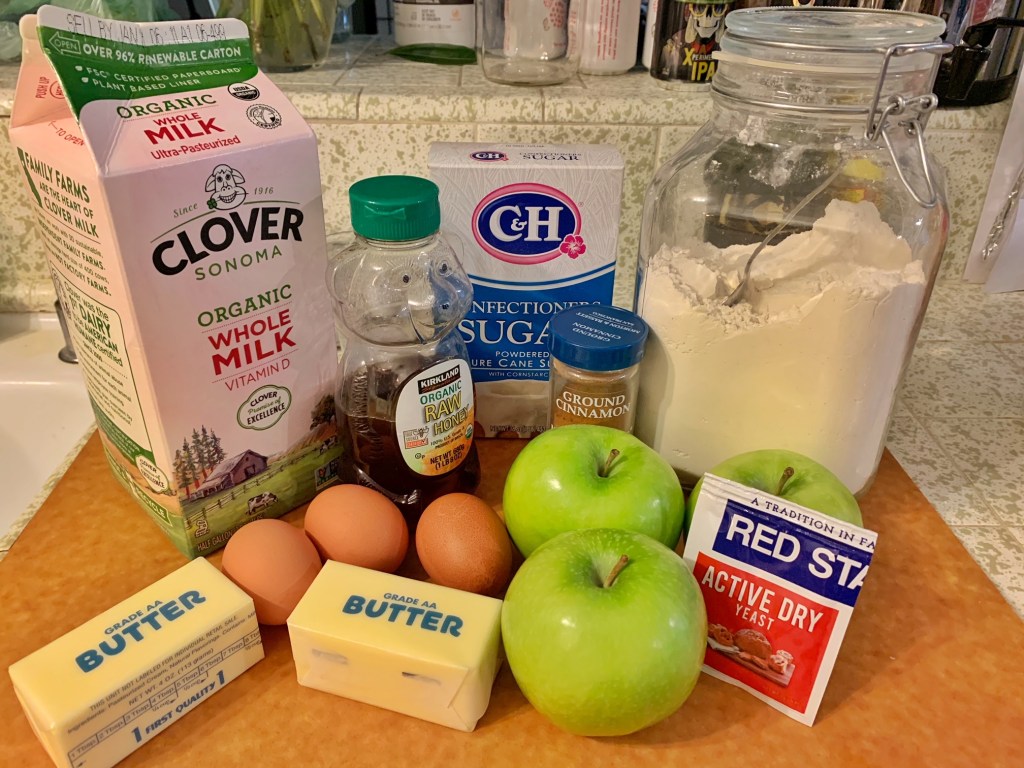 - Combine warm milk, yeast, sugar, and honey in a large bowl. Whisk all the ingredients together and let stand for about 10 minutes to bloom the yeast. Beat the eggs together, and after the yeast has bloomed, add the eggs and all the flour into the mixing bowl. Cut up 0.75 cup (170 grams or 1.5 sticks) of the butter into small cubes and add them to the mixture.