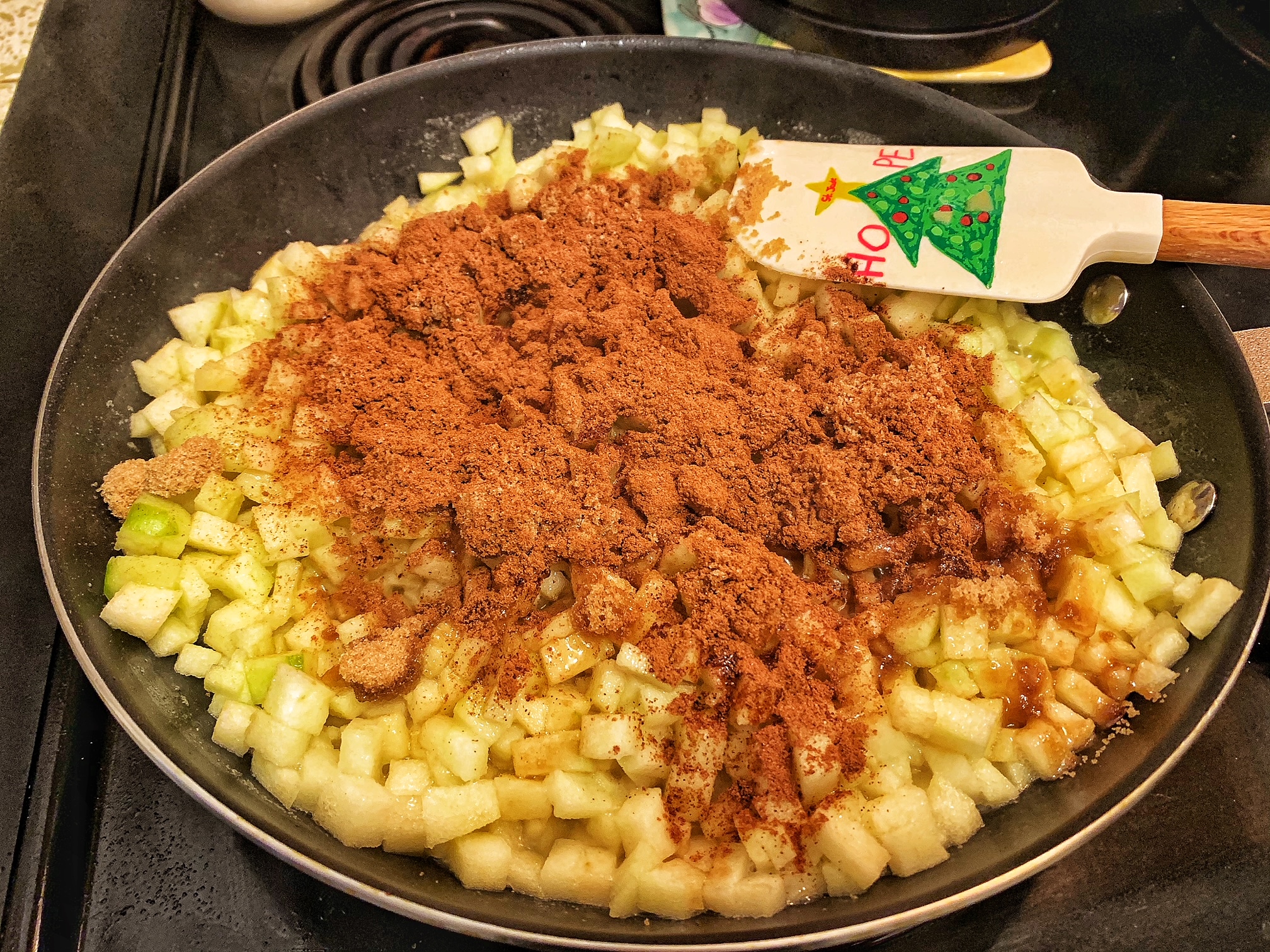- While the dough is rising, prepare the apple filling: in a large nonstick pan, melt the remaining 0.25 cup (55 grams or 0.5 stick) butter over medium heat. After the butter has browned slightly, add the apple pieces and stir for a minute or two. Add the brown sugar and cinnamon, and stir again, tossing a few times to make sure that all the apple pieces are evenly cooked. The apples should start releasing some juices as well, so let the mixture simmer for a few minutes.