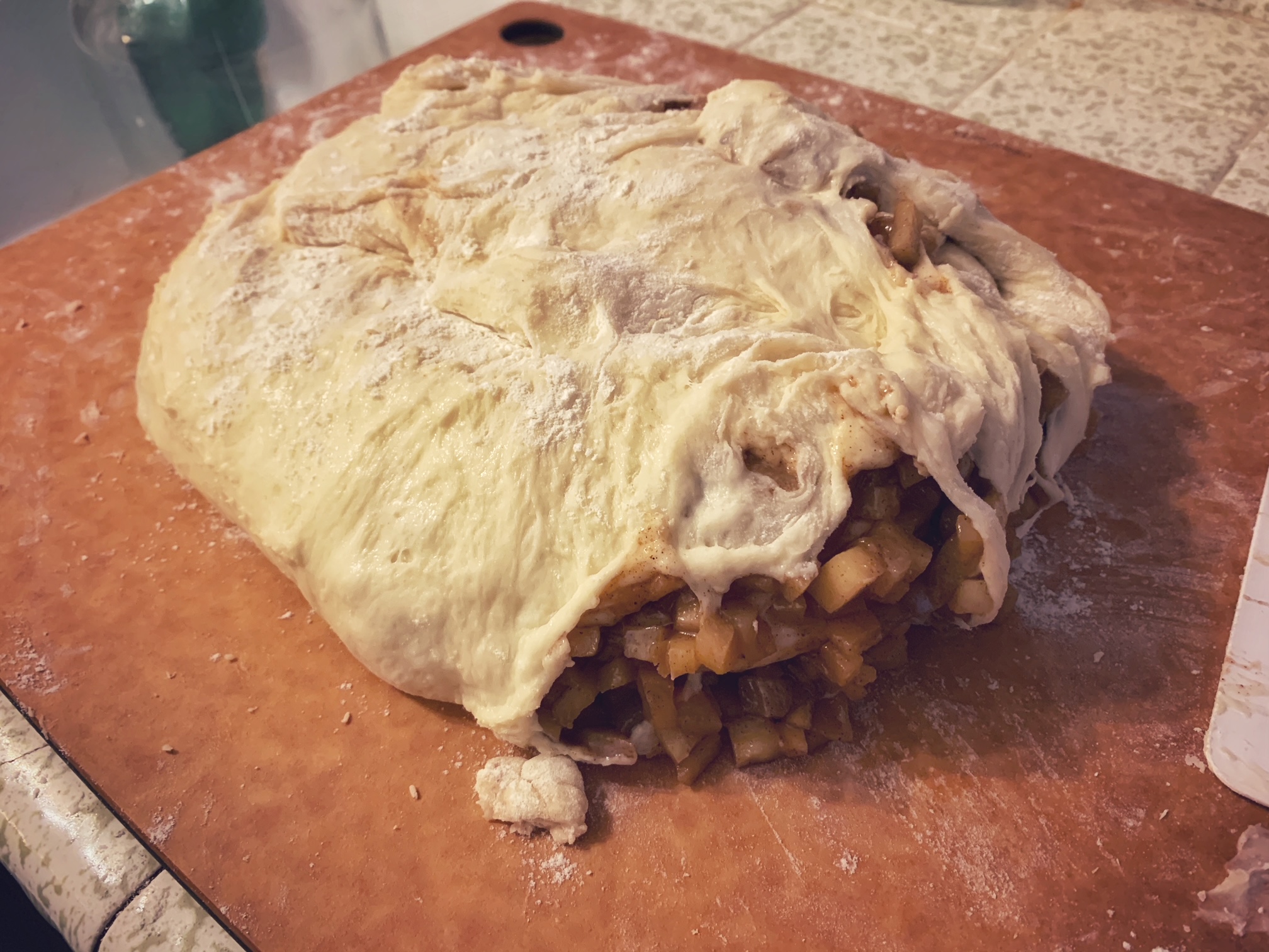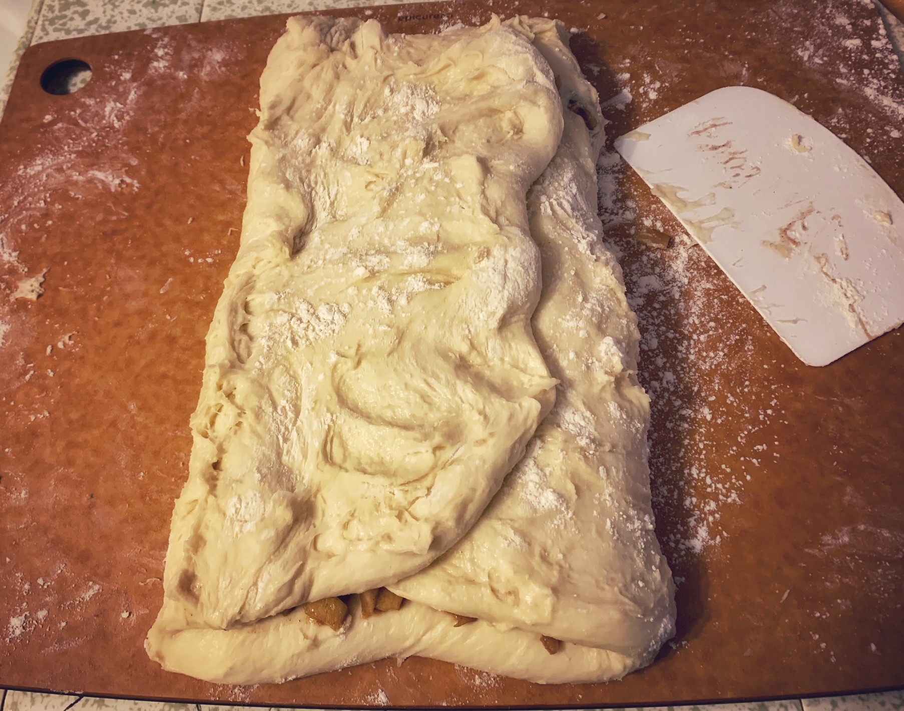 Fold the dough on top of itself into thirds, like a pamphlet. Shape the dough back into a ball. This will be a nearly impossible task but don’t stress. Any apple pieces that fall off should just be stuck back into the dough wherever you can fit them. It’ll all be okay in the end. Trust the process. Put the entire dough ball back into the mixing bowl, cover it again with another plastic wrap and then let it rise for 1 more hour at room temperature.