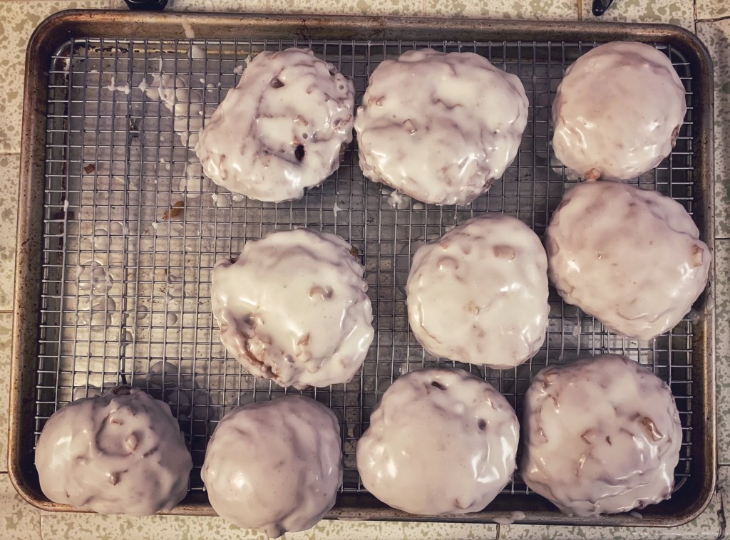 - After all the fritters are fried, prepare the glaze: combine the powdered sugar with milk and bourbon and whisk until smooth. You want a mixture that’s about as thick as honey. Add more sugar or more milk to reach the right consistency. Dip each fritter by the surface and then lay it back down on the rack. After you dip all the fritters, then go back and dip them one more time for a double glaze.