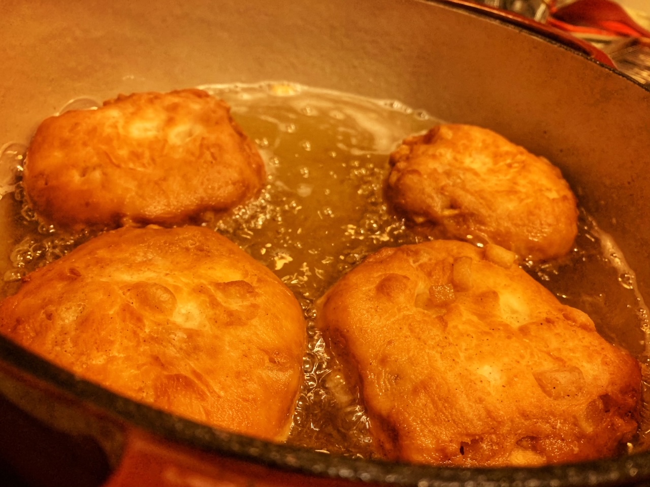 - Re-flour your work surface and then dump the dough out again. They will look like a hot mess but even hot messes can be pretty amazing, so once again just trust the process. Roll out as best as you can, to about 1-inch (2.5 cm) thickness and then cut them into small squares about 4×4 inches (10×10 cm). For me, this yielded about 28 pieces. You can cut them smaller if you like because they will expand when you fry them. Set the fritters aside on well-floured sheet pans to prevent sticking.