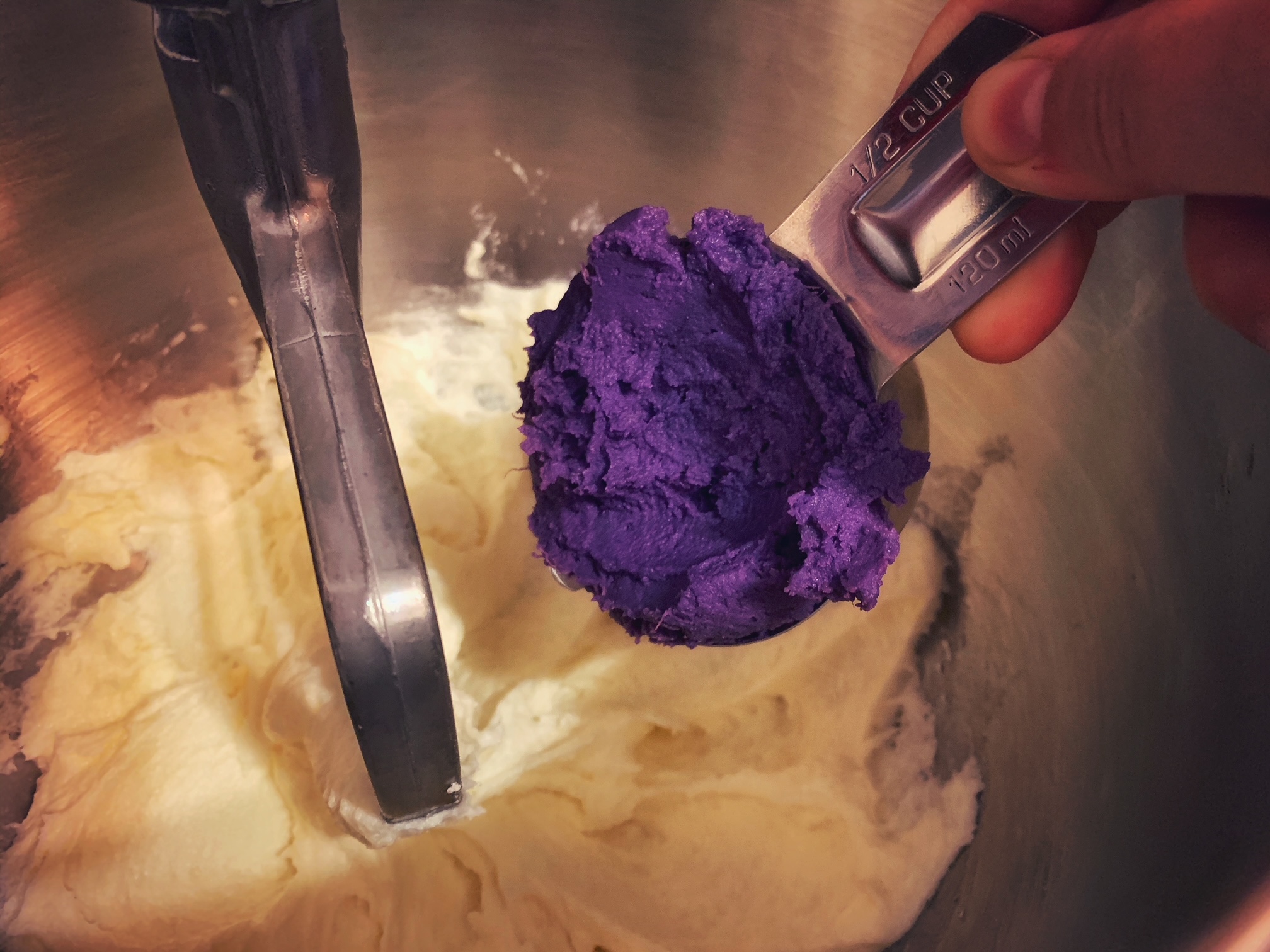 - Add in the ube puree and ube extract, then mix well. This is probably my favorite part of working with ube. The purple swirls are just so pretty. Yes, I have also been guilty of buying items for the packaging. Go ahead, fight me on it.