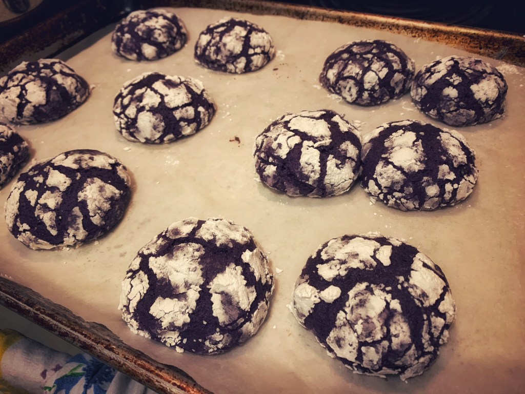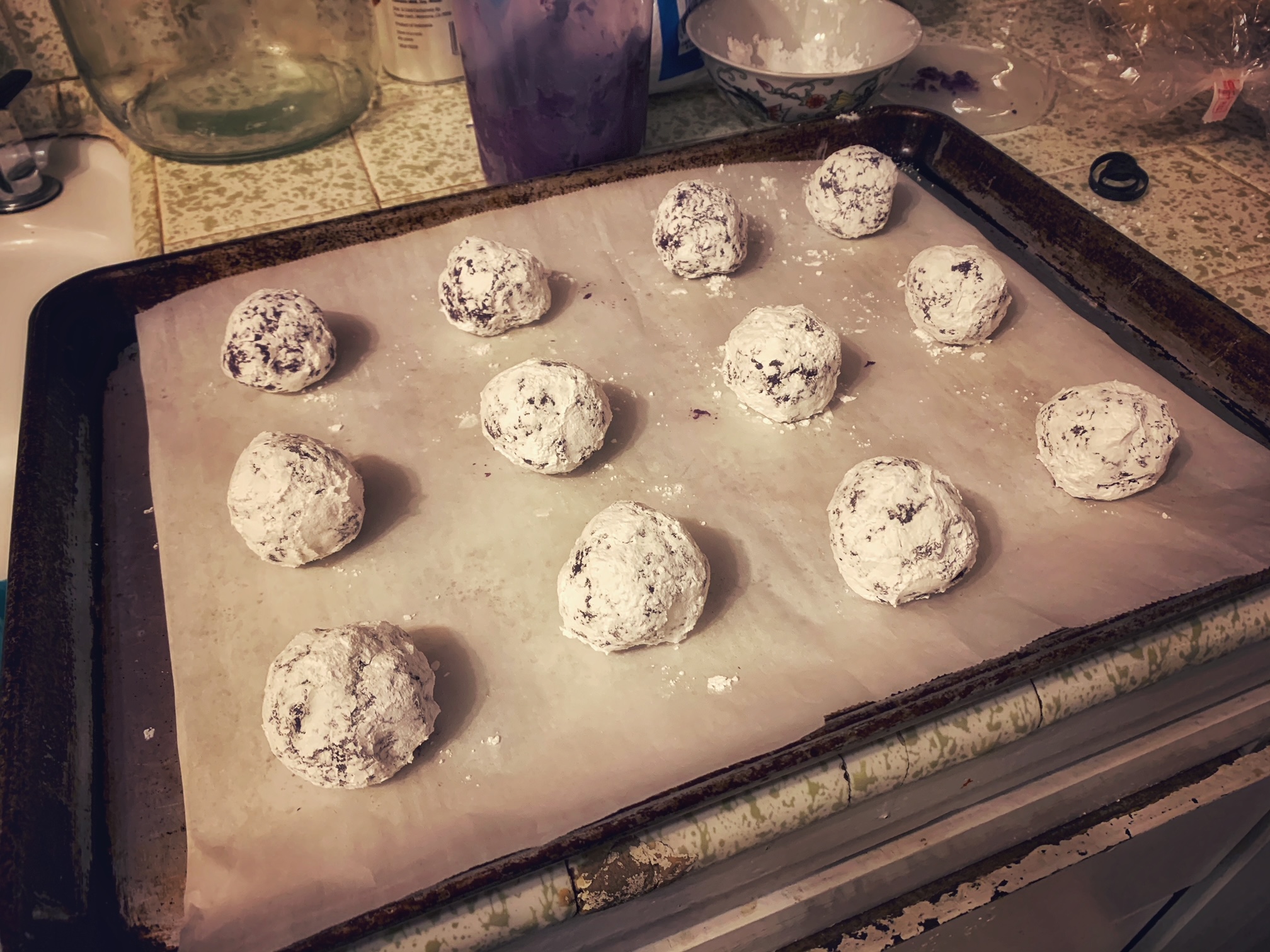 - When you are ready to bake, put the powdered sugar in a small bowl and line two sheet pans with parchment paper. Scoop out about a golf ball-size cookie dough and roll them in your hands to make a round shape. Roll the ball in powdered sugar a couple times around to make sure they are covered well. They will crack and crinkle when you bake them, so you will definitely want a good enough layer of powdered sugar. Put them on the sheet pans, about 2 inches (5 cm) apart. Put the cookie dough balls into the freezer while you preheat the oven to 375°F. This will help you get a thicker, fudgier cookie. And it really shouldn’t take more than 10 minutes so the dough won’t be frozen or anything, just extra chilled.