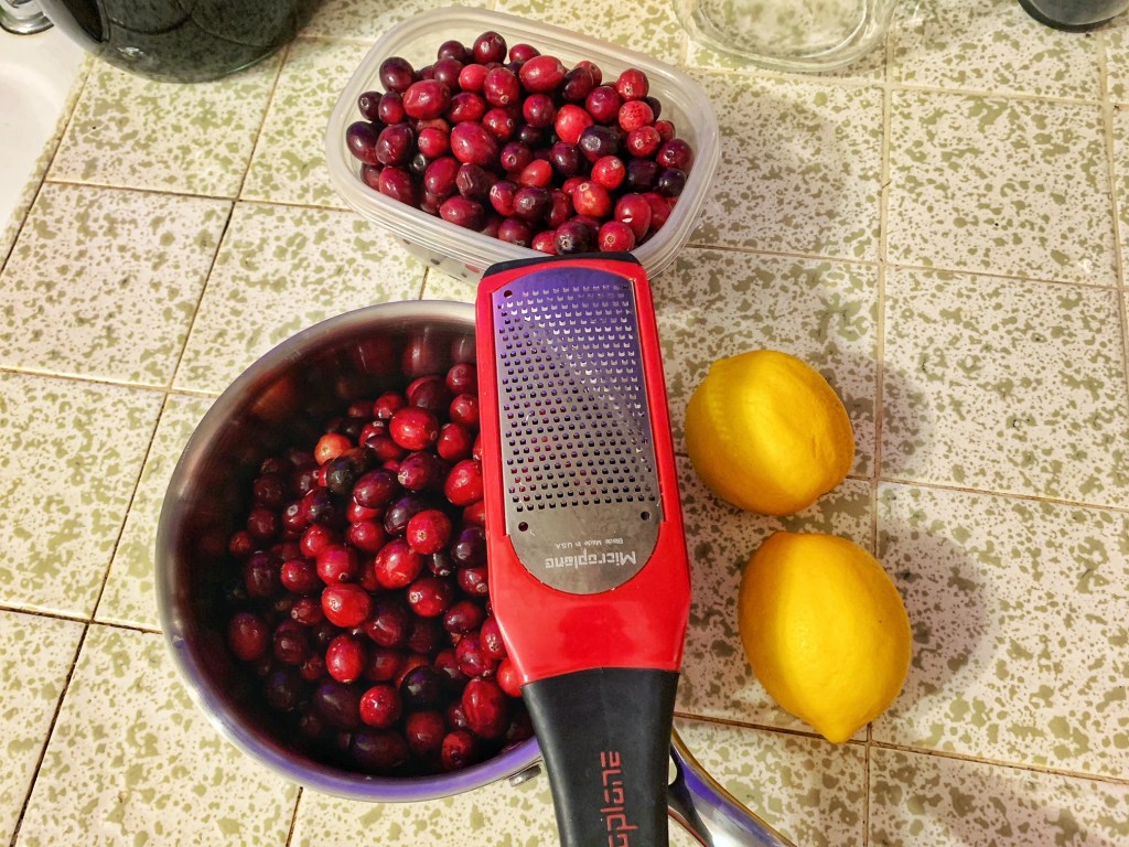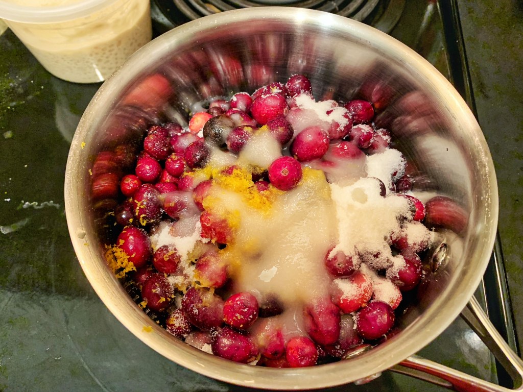 - Zest two of the lemons into the saucepan and stir to combine. Put the saucepan over medium high heat and bring to a boil while stirring occasionally. Continue boiling until the berries burst and turn jammy, much like the radar. During this time you will hear nice popping sounds that reminds you that cranberries are hollow on the inside, much like the heads of some of your exes. It should take around 10-15 minutes to reach the right consistency but use your noggin’, I believe in it. Remove from heat and set aside. If you prefer, you can also make this a few days ahead and keep the mixture in the refrigerator until ready to bake.