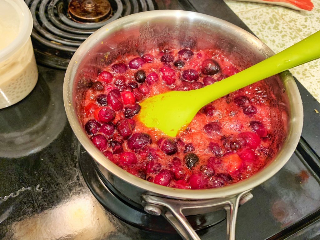 - Combine cranberries, sugar, and the sour ale or hard cider in a saucepan. If you don’t have these on hand or prefer to not use them, substitute with water. If you do use sour ale hard cider, make sure to sip the rest while you bake. It’ll make your baking experience much more delightful.