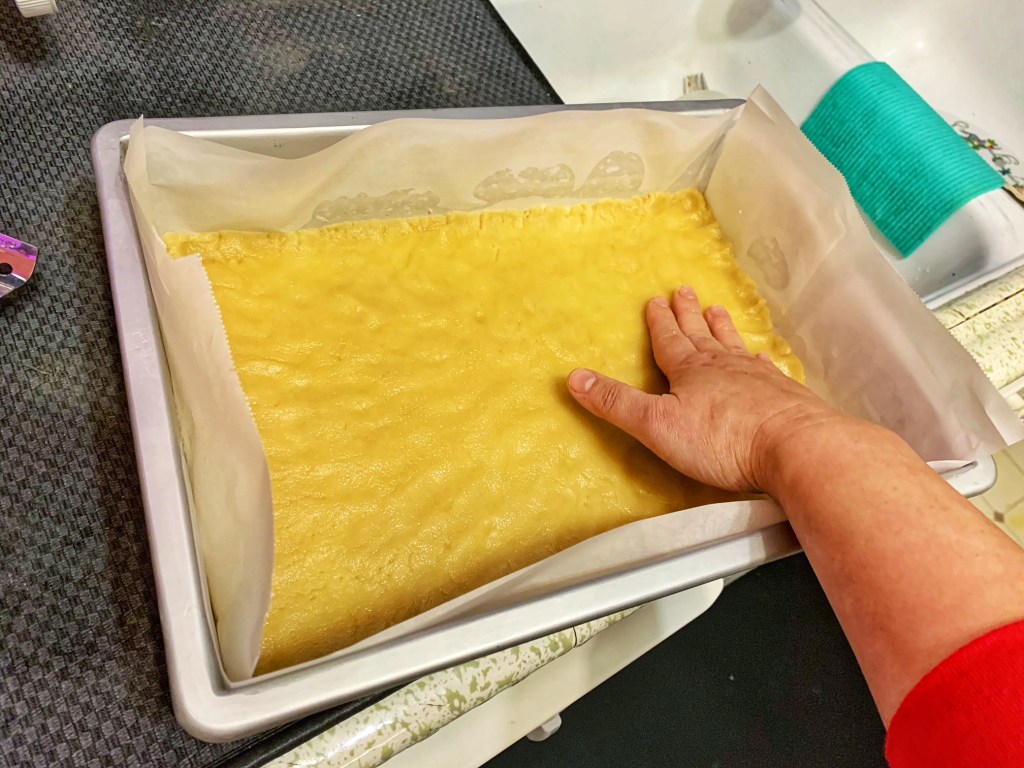 - Preheat oven to 350 degrees F and line a 9×13 inch (23×33 cm) with parchment paper. Make sure to create a sling because the purpose of this parchment paper is to make it easier to take the bars out of the pan after it’s baked and cooled.