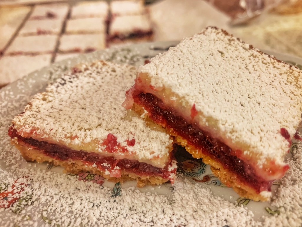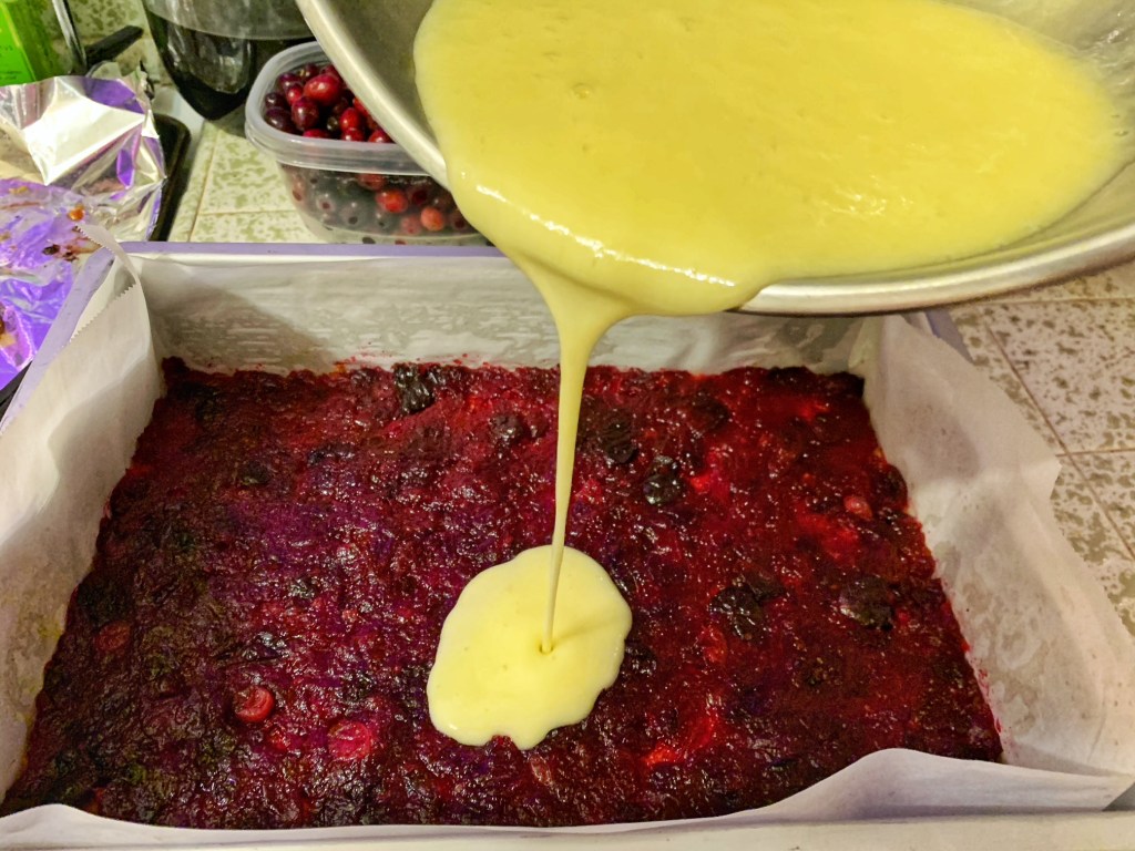 - After the crust is baked, take it out of the oven and let it cool for a few minutes and then spread the cranberry mixture evenly over the crust. A small offset spatula is perfect for this job but if you don’t have it, use your hands and fingers. They’re the most natural spatula you can find. Just.. you know, wash your hands first. After that, slowly and carefully pour the lemon mixture on top of the cranberry mixture to create the final layer.