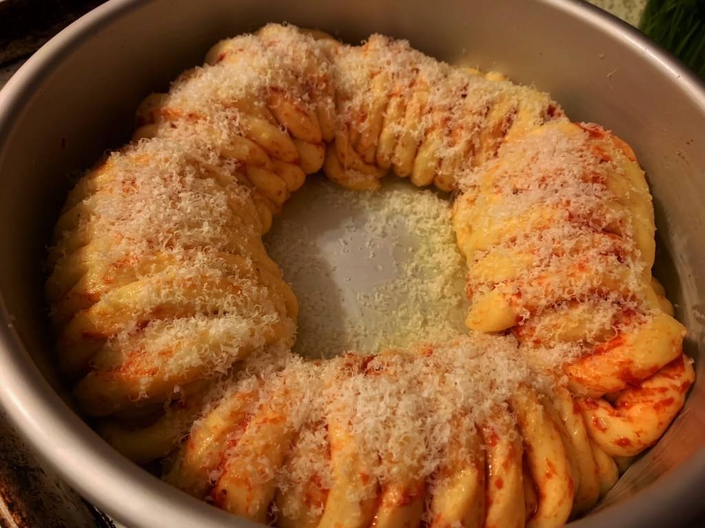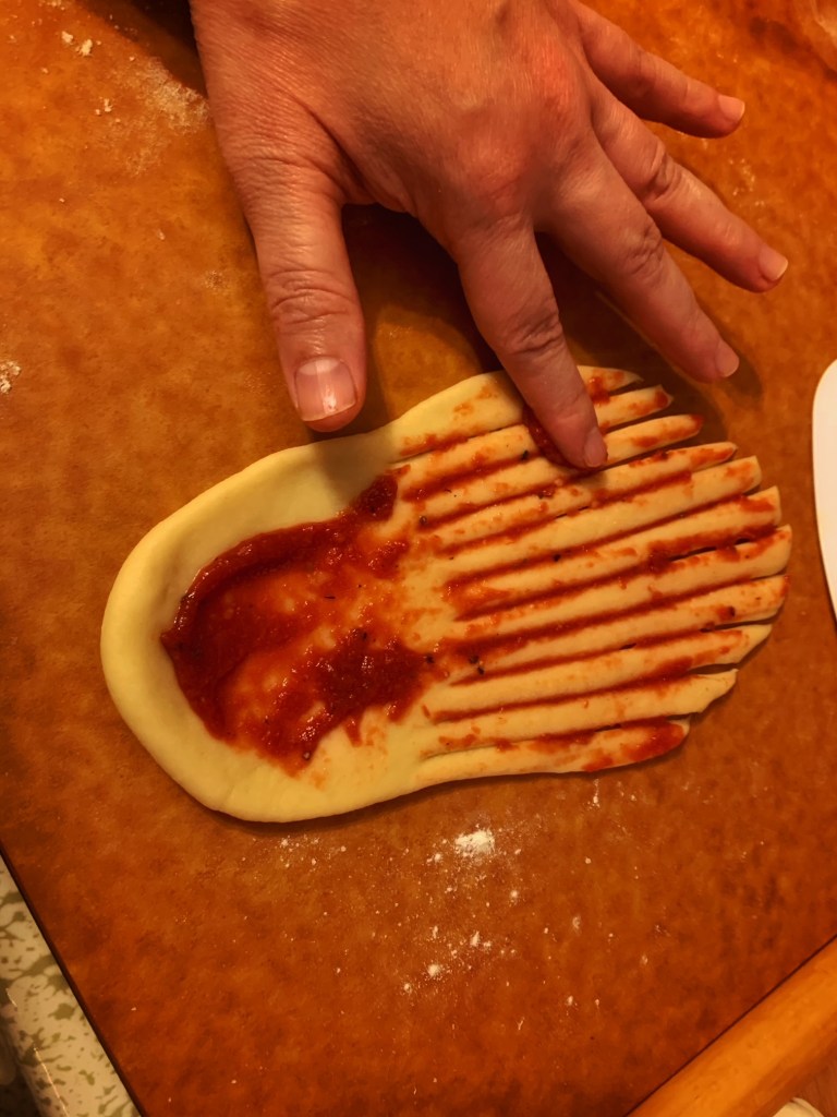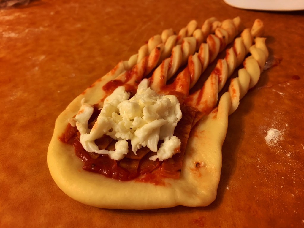 - On the half that is not cut into strips, spread a heaping tablespoon of pizza sauce. Sprinkle with pepperoni strips and shredded cheese. Fold the sides, then roll from the bottom (uncut portion of the dough) towards the top. Make sure to roll it rather tightly, keeping all the strips together. These strips are what will give the wool or yarn-like appearance to your bread. Lay each roll into the prepared cake pan to form a large ring. Cover the pan with plastic wrap or clean dish towel and let rise in a warm spot for one more hour.