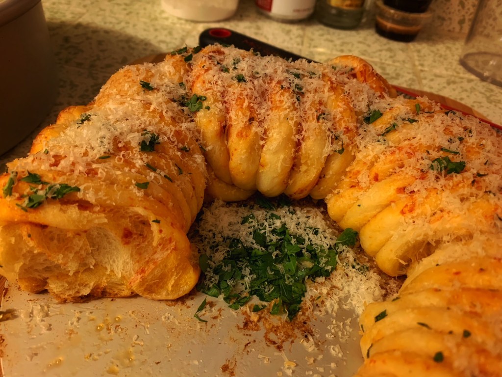 - Bake for about 18-20 minutes. Mine didn’t turn out very golden brown, I think it might be because the oven temperature is quite low for this. But it was still fully cooked after that amount of time, so it’s all good. Right after you take the bread out of the oven, add chopped parsley into the garlic butter and then brush the bread once more with this mixture. Let cool for 5 minutes and then run a thin knife along the sides to loosen. After that, it should pop out of the pan pretty easily but be careful as everything is still pretty hot to the touch. Enjoy the pizza wool bread!