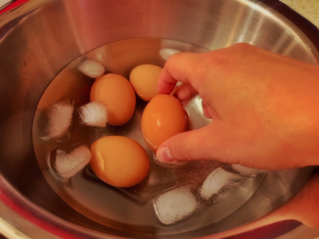- If you haven’t done so, peel the eggs and lay them on a towel to dry off. This will make it easier for the meat to stick. I mean, the drying will make it easier. Peeling the egg shells is just you know, common sense.