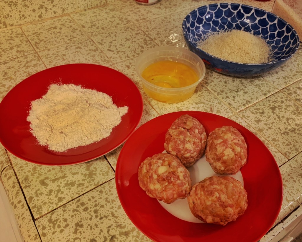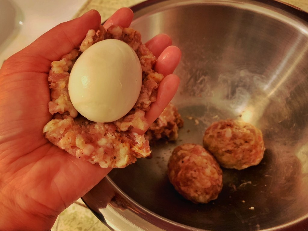 - Take each part of meat and flatten them in your palm, then put one egg and then carefully cup your hands to stretch out the meat to cover the entire egg. You may get some bald spots here and there, but don’t worry, it’s just a sign of aging. Oops, I mean, you can just keep cupping your hands and spread the meat around to cover those bald spots. Repeat with the remaining eggs and meat.