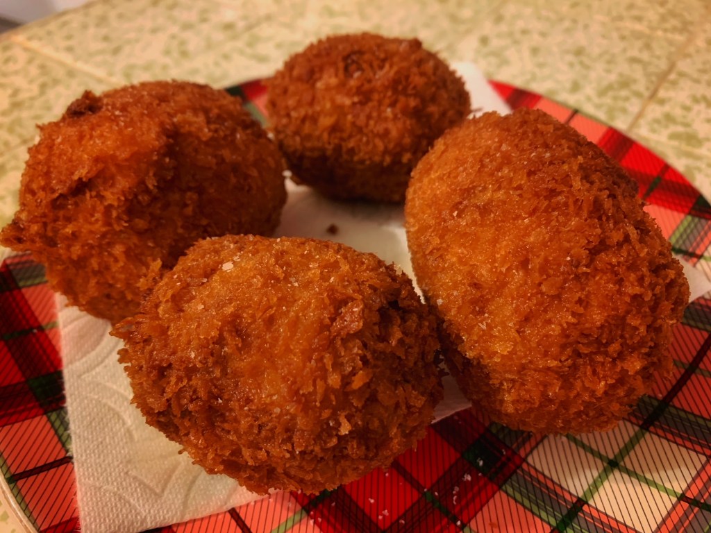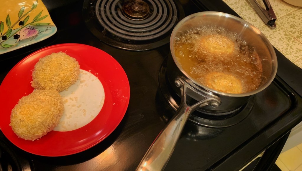 - Heat up your oil to 350-375ºF (180-190ºC) and then fry for 5-6 minutes. When I was making this batch, I had leftover panko that I didn’t want to throw out so I double battered two of my eggs. You will see that those two are larger than the others. If your balls are unevenly sized like these, you should see a doctor. Or not, because maybe it’s normal. Who knows? *shrugs* 🙂