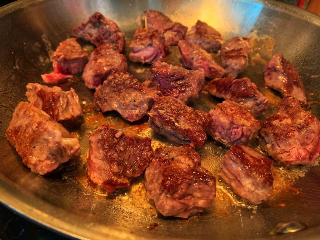 - Lay the beef stew meat on a paper towel-lined plate or sheet pan and pat dry with another paper towel. Sprinkle with salt, pepper, and 2 tablespoons of flour. In a saute pan over medium high heat, brown the beef in batches with about few teaspoons or oil. Depending on how large is your saute pan, you may want to do this in 2 or 3 batches. Just make sure you don’t overcrowd the pan so you can get some good browning. Set aside the browned beef in a large mixing bowl.