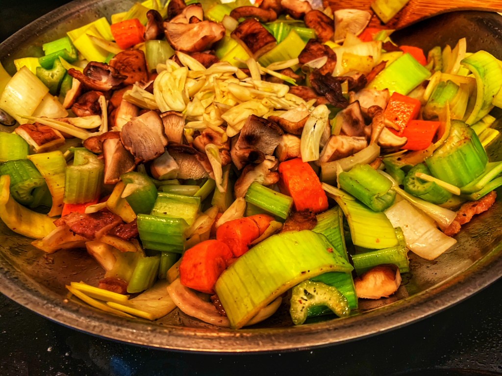 - After all the beef is browned, lower the heat to medium low and add in the sliced bacon. Cook until crispy and set it aside with the beef. Leave the rendered fat in the pan, raise the heat to medium, and put in the chopped vegetables. I usually like to put in the vegetables one at a time, cooking for a minute or two before adding the next one. so I can get good browning with these as well. If you want to do that, the order here would be: mushrooms, leek and onion, garlic, carrots, and celery. Sautee everything until the onion and leek are slightly soft and then set aside.