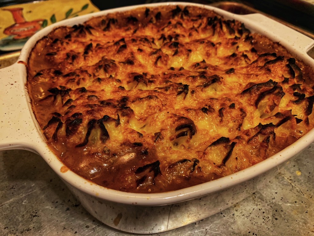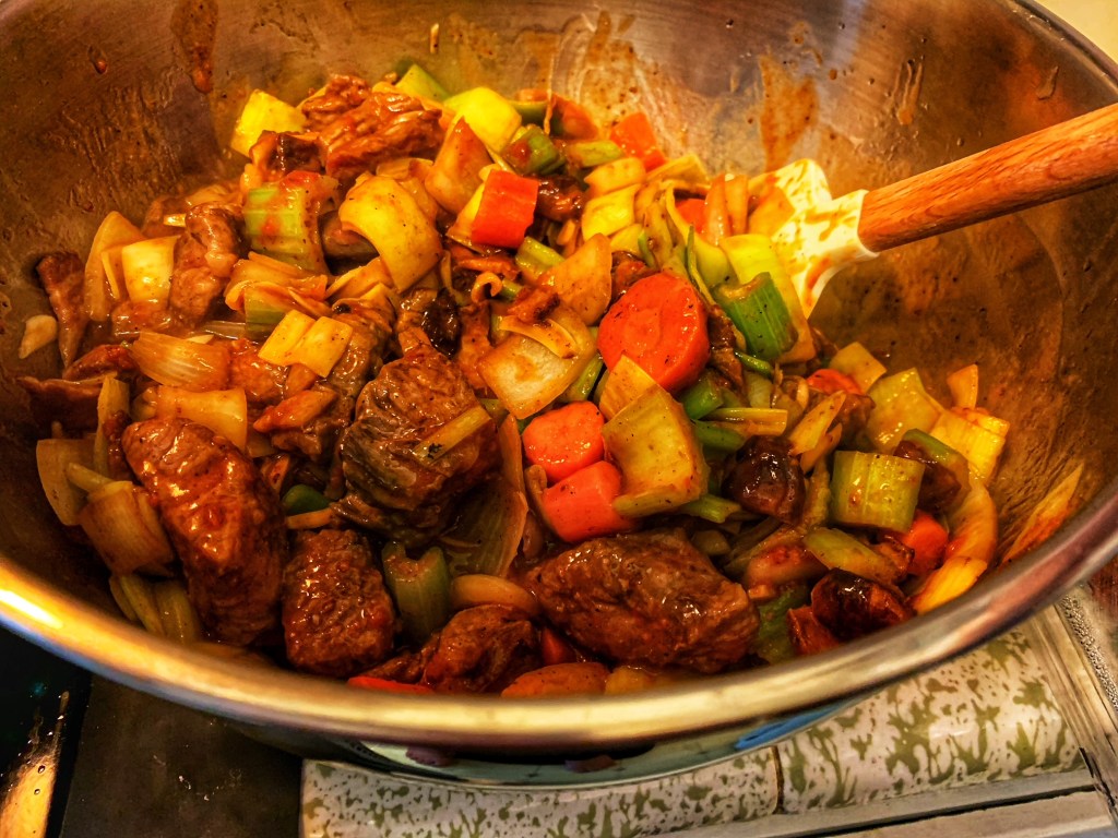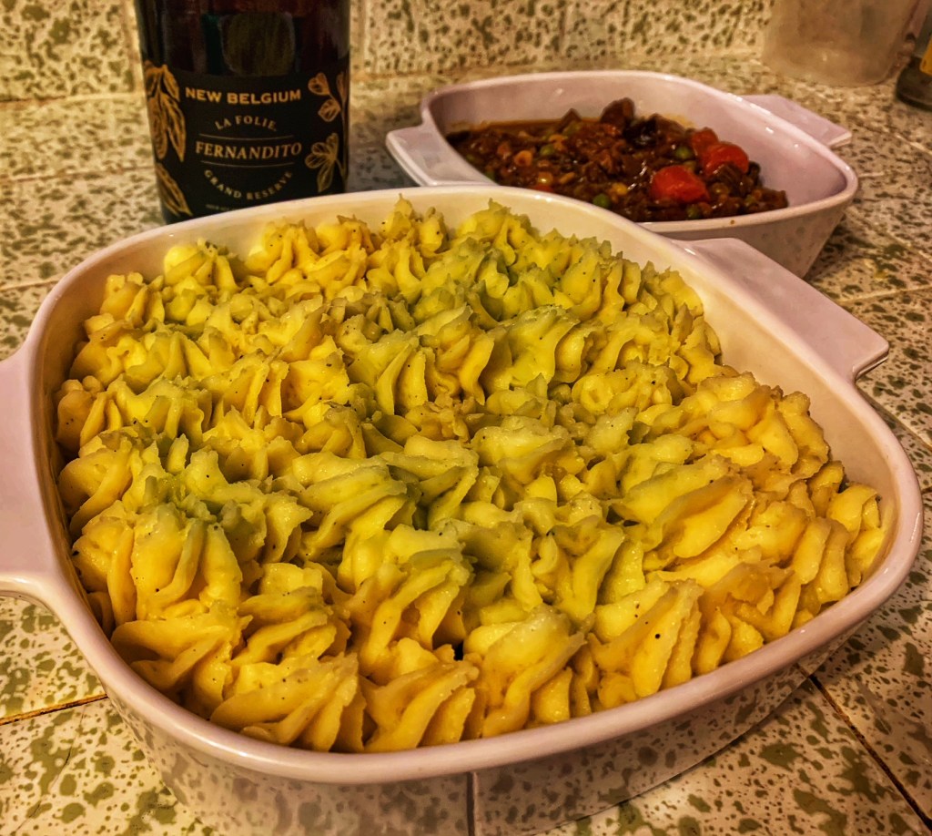 Fun fact: there is an Indonesian version of shepherd’s pie. Like the famous English playwright wrote: a meat and potato casserole by any other name would taste as delicious. What’s that? He wrote about a rose instead? Oh but meat and potato casserole is so much better! Well anyway. The Indonesian version of shepherd’s pie is called: Pastel Tutup. There’s a snack called Pastel which looks just like an empanada. Tutup is the word for cover. So I think it got its name because it’s the same filling as an Indonesian empanada but instead of being wrapped in pastry, it’s covered with potatoes. This one below is not the Indo version. It’s the Irish version, complete with some nice dark beer in the filling.