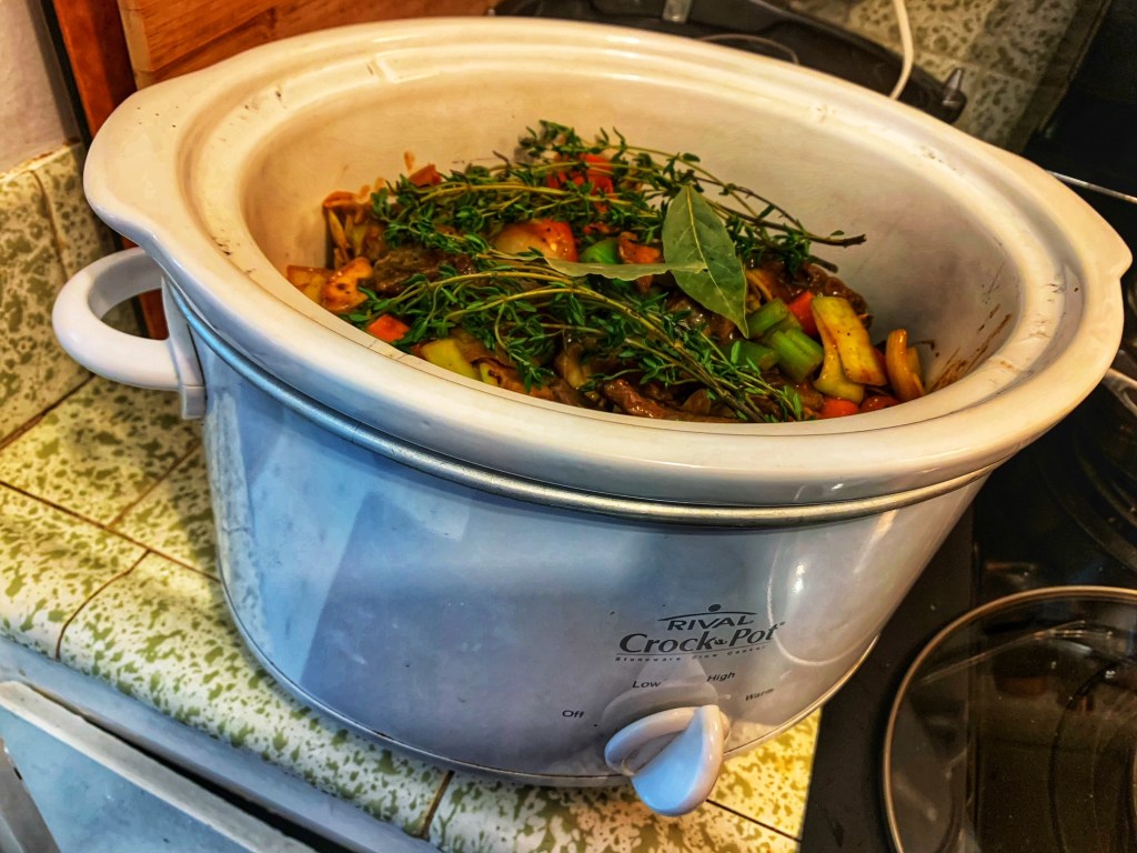 - Pour the entire mixture into a crockpot, adding the water/chicken stock and thyme and bay leaves on top. Cover and let it cook on high for about 5-6 hours. Depending on how hot your crockpot runs, you may want to check about 3 hours in. You want the beef to be tender but not falling apart. In my old crockpot, it took about 5.5 hours total.