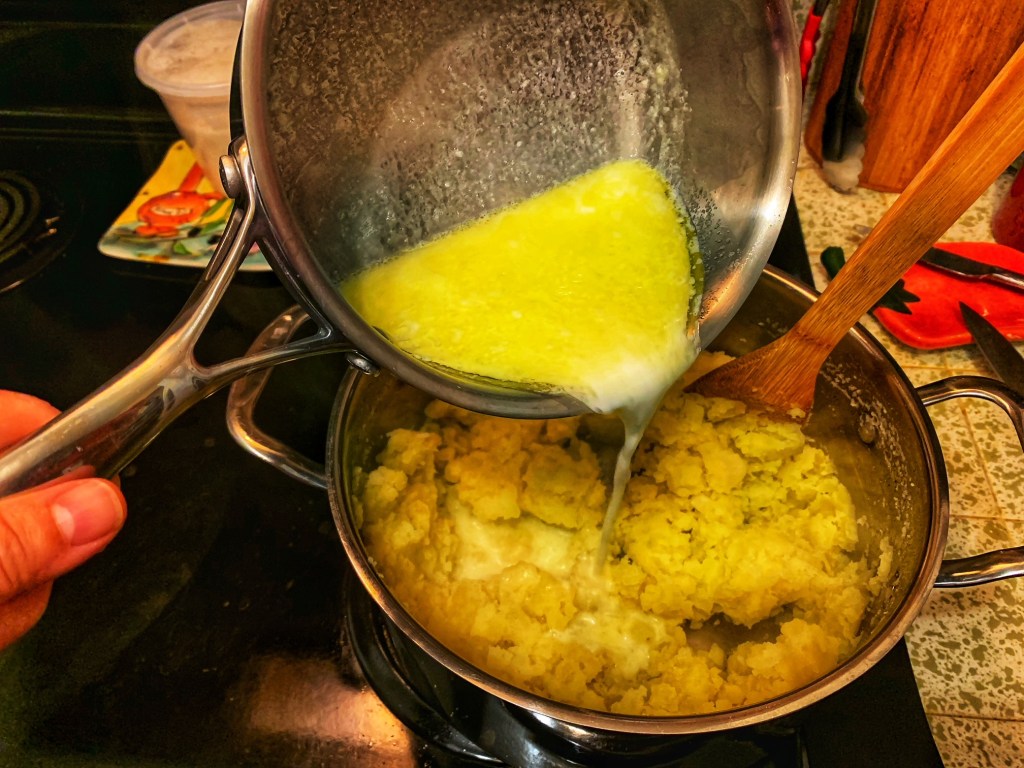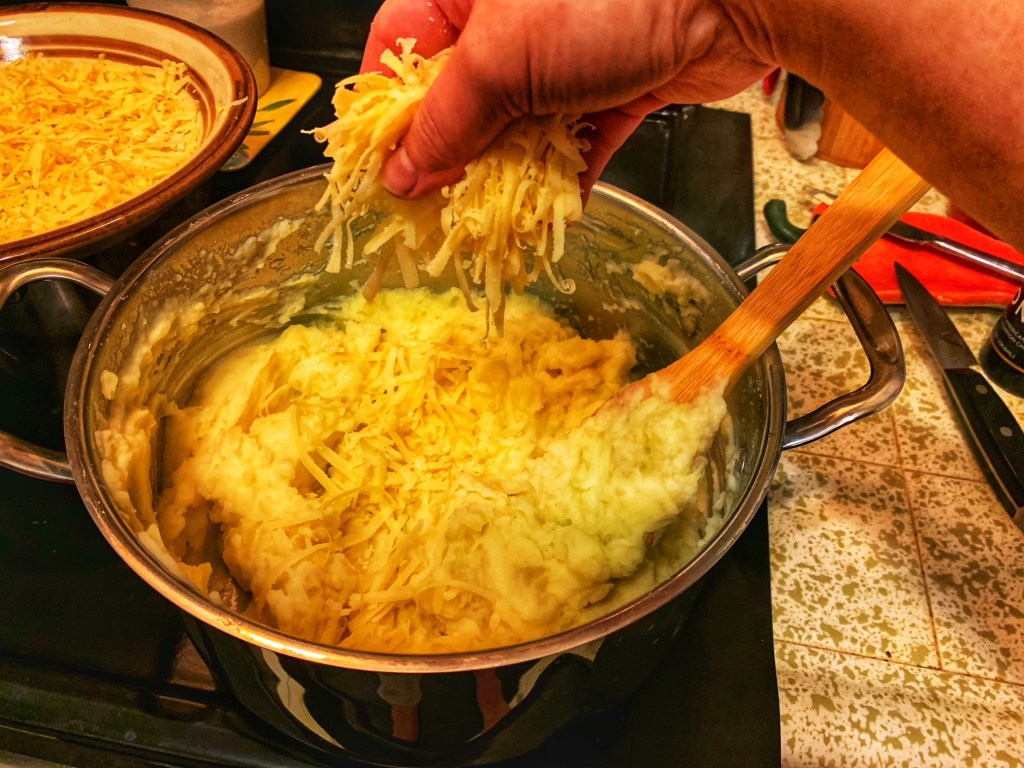 - In a small pot, heat up the milk with butter until the butter is melted. Stir in the milk-butter mixture into the mashed potatoes and mix well. Add 1 cup of the shredded cheese into the potato mixture and stir to combine. Season to taste with salt and pepper. Set aside in a warm spot and keep it covered so it doesn’t dry out.